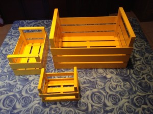 il Set Cassette Yellow è costituito da tre cassette di diverse dimensioni costruite come le usuali cassette che vediamo al mercato ca il materiale utilizzato è il legno di abete proveniente da imballaggie pallet, opportunamente piallato oppure anavanzi di compensato recuperati presso segherie destinati alla discarica.